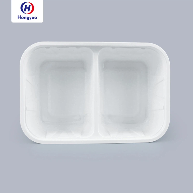Contenedor de alimentos desechable de dos compartimentos en forma de caja cuadrada Marca: Hongyao Color: Blanco y negro Función: Contenedor de alimentos, Envasado de alimentos. Material: PP apto para alimentos Cantidad: 300 piezas con tapa por caja.